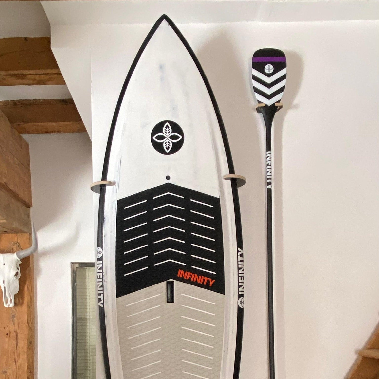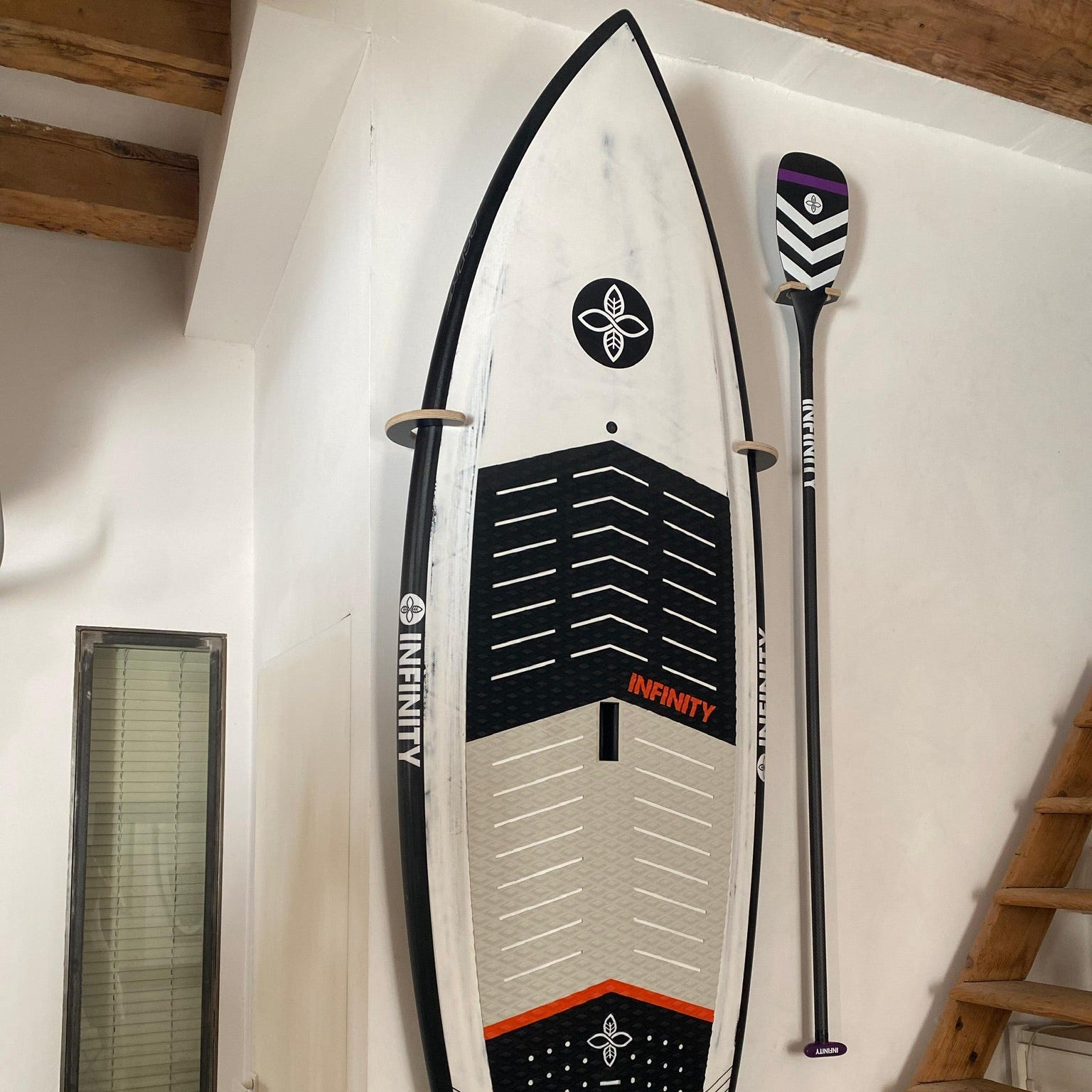 Fixez l’accroche sous la « pale » de votre pagaie (voir photo) et profitez d’une installation stable et discrète. Associée à notre Grand Support Mural Vertical Rack Ta Board, votre stand-up paddle et votre pagaie deviennent un véritable élément décoratif.