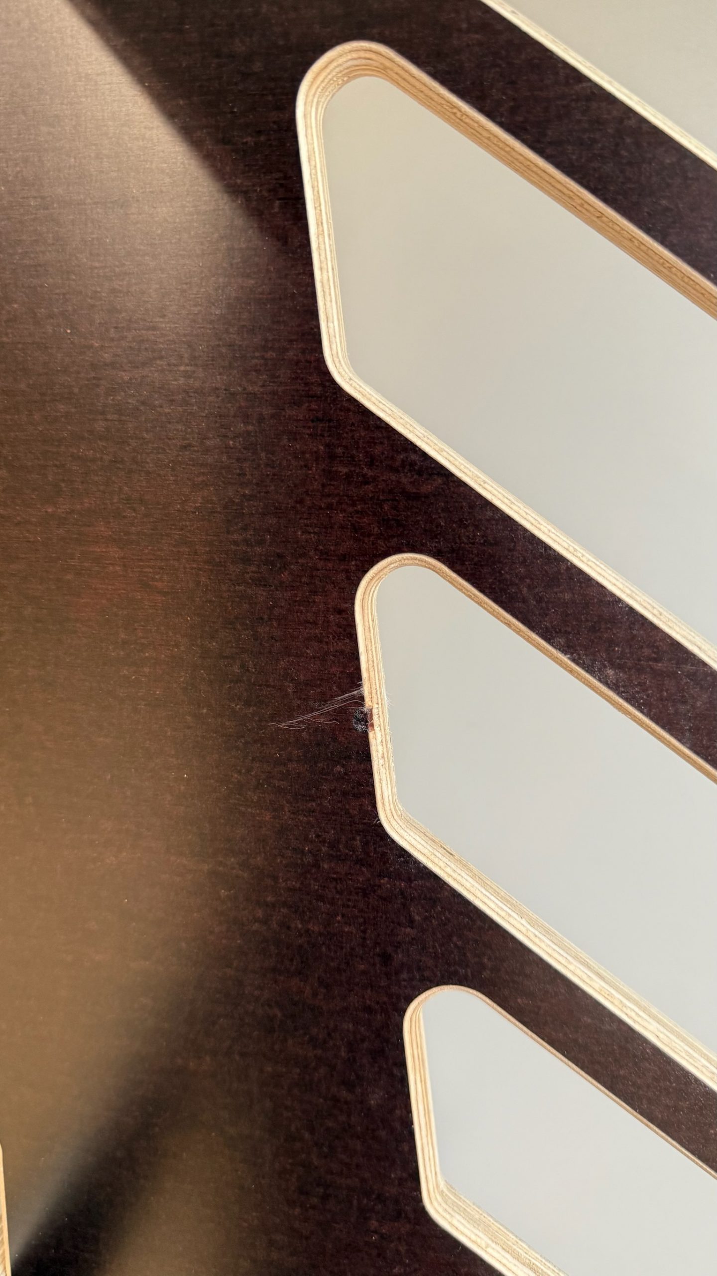 Nous utilisons le bois de bouleau sous la forme de contreplaqué. D’une épaisseur de 15mm pour 11 plis croisés, il garantit une rigidité et une tenue dans le temps maximale. Issu d’une exploitation forestière raisonnée et Européenne (1 arbre coupé, 2 arbres replantés), il est certifié FSC & PEFC* et utilisable en extérieur car certifié CTBX extérieur**. La colle utilisée pour le contreplaqué se compose de lignine biologique*** issue de résine d’arbre. Par conséquent, c’est un contreplaqué garanti sans solvant et sans produit chimique. Un film de protection esthétique, brun foncé/noir, résistant et recyclable recouvre et protège le produit.